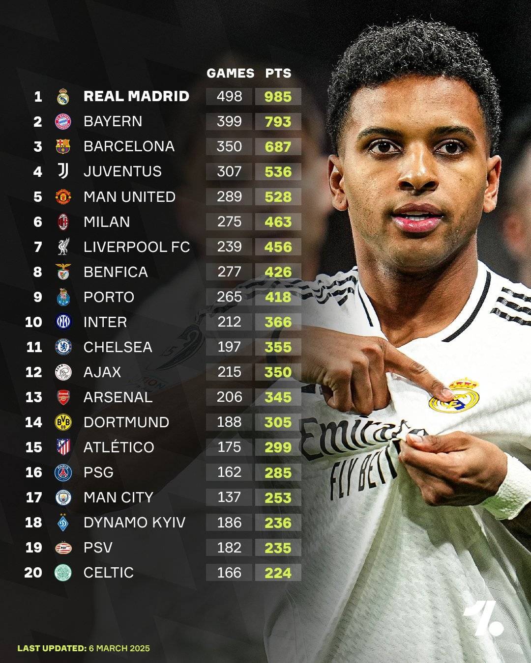 欧冠历史积分榜(截至2025年3月6日):