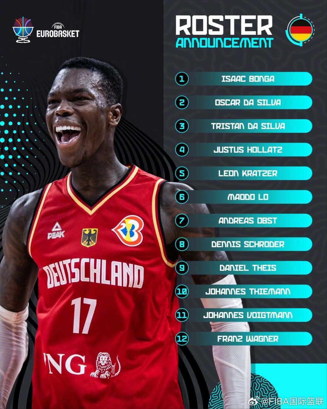 北京时间2025年8月25日, 德国男篮公布欧锦赛12人大名单。丹尼斯-施罗德、小瓦格纳领衔。